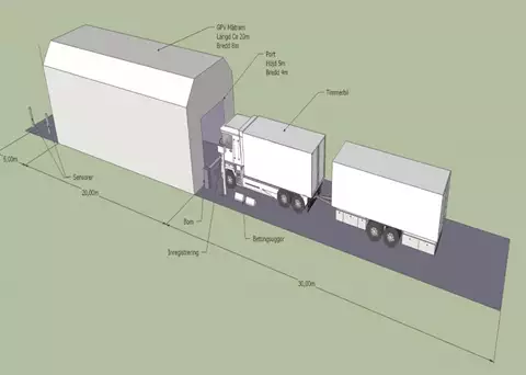 Från vänster: Infart till mäthallen med chaufförens ankomstregistrering till vänster. Höger: Insidan med kamerasystem och markörer