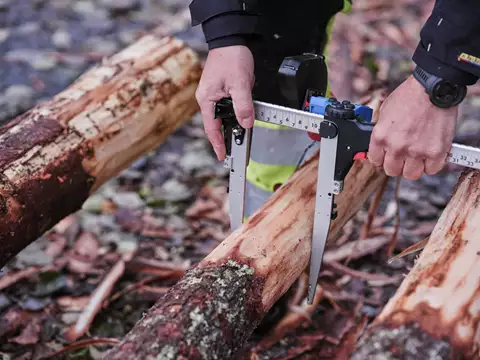 Varje år mäts miljontals kubikmeter virke runtom i Sverige. Ur denna mängd faller det ut stickprov av stockar som mäts igen, fast den här gången ännu mer noggrant. Allt för att uppnå största möjliga mätningskvalitet. Chef för denna verksamhet på Biometria är Jonas Törnsten.