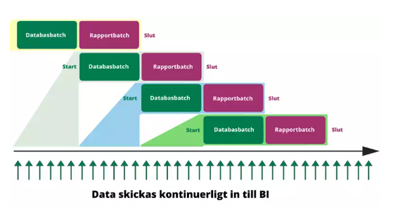 - Databasbatchen som laddar BI-systemets databas körs kontinuerligt under dagen. Så fort den är klar börjar nästa. Den tar med allt data som kommit till BI sedan senaste omgången.