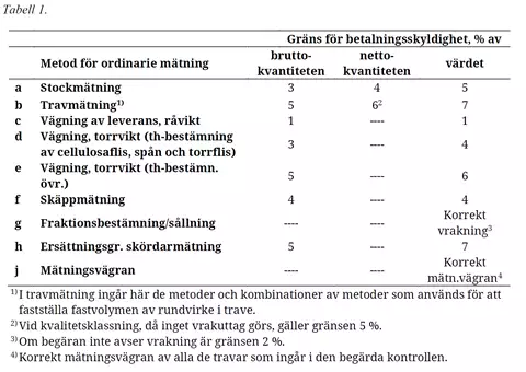 I de fall en begärd kontroll avviker mindre än de uppsatta gränser som framgår i avsnitt 6 och bilaga 1 i dokumentet Biometrias kontroll av virkesmätning, får den part som begärt kontrollen bekosta en del av kostnaden, för närvarande 5 981 kr. Gräns för betalningsskyldighet beror på vilken grund kontrollen begärts (Bruttokvantitet, nettokvantitet, värde, vrakning eller mätningsvägran). Se bild nedan.