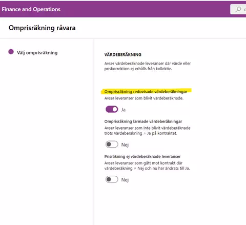 Funktionen Omprisräkning fungerar så att den tar alla leveranser som väljs ut i Omprisräkningsformuläret och räknar om. Omprisräkningen baseras på den senaste uppgiften på FLK-rad, vilket betyder att ett felaktigt certifieringstillägg tas bort också på leveranser bakåt i tiden.