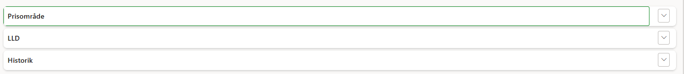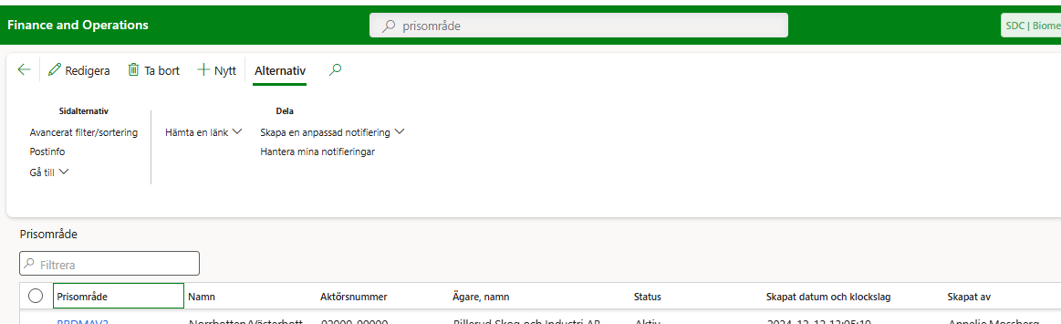 - Alla prisområden med status aktiv finns tillgängliga i en förteckning. Dessa kan väljas in i prislistehänvisning och priskomponent.