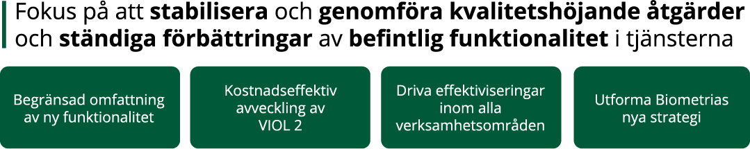Detta material ger en översiktlig bild av prioriterade behov och aktiviteter inom ramen för Biometrias utvecklingsprocess. Det är inte avsett att spegla detaljerad planering på systemnivå, såsom mindre optimeringar eller buggrättningar.