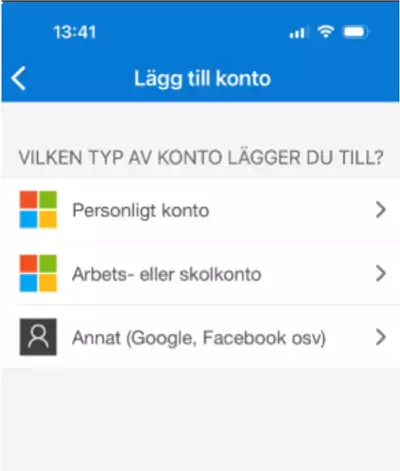 Choose between "Personligt konto" (personal account), "Arbets- eller skolkonto" (work- or school account) or "Annat" (Other).