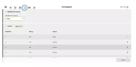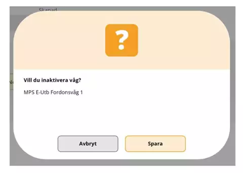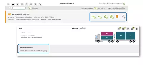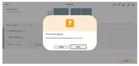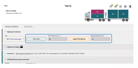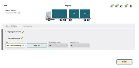 - Aktuell vikt samt bekräftar med Spara vid invägning. Därefter Slutför vid utvägning.