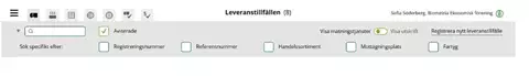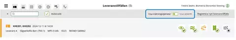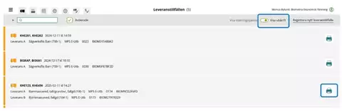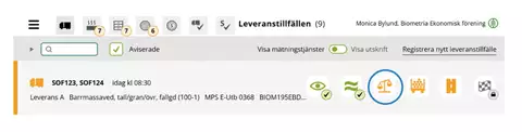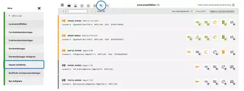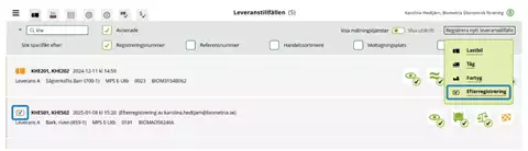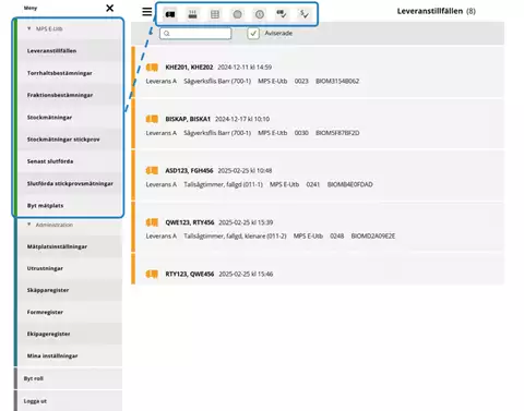 I bilden nedan har vi valt menyvalet Leveranstillfällen under menyn för mätplatsen, vilket gör att menyvalen för mätplatsen visas som flikar.