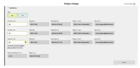 Så här ser det ut efter Vägning vid avgång när medeltara eller fast tara är angivet i Ekipageregistret. Medeltara eller fast tara kommer upp per automatik.