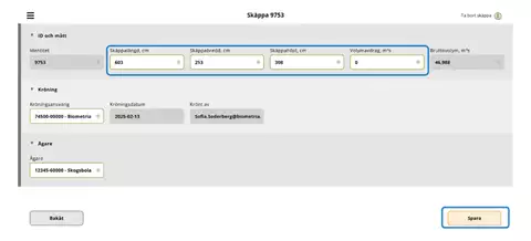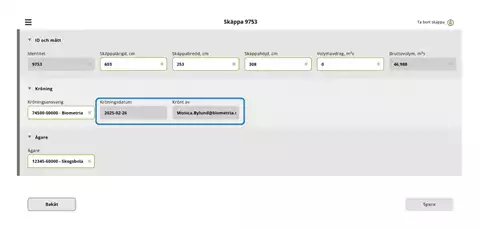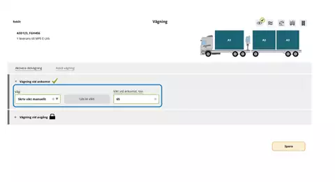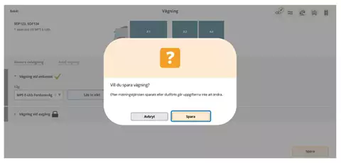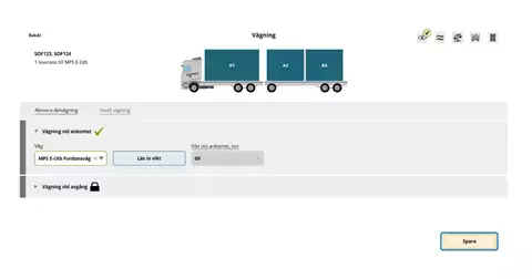 - Bekräfta med Spara vid invägning och Slutför vid utvägning.