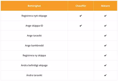 - Chaufför – Kan göra moment knutna till aktuellt mätningsflöde i ett leveranstillfälle. Chaufförernas gränssnitt i Mätplatsstödet (MPS) benämns som Chaufförsklienten.