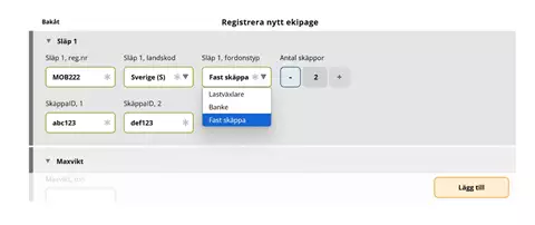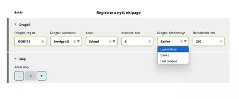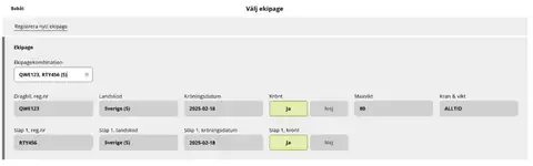 Valet är inte synligt per automatik men finns under fältet Ekipage. Förvalt värde är alltid Nej.
