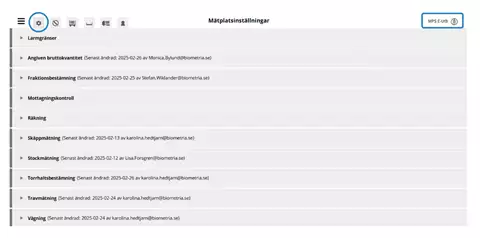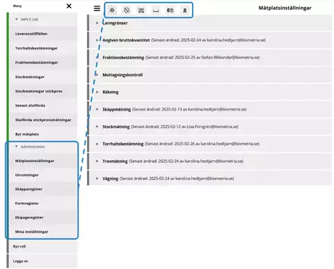 I bilden har vi valt menyvalet Mätplatsinställningar under menyn för administration, vilket gör att menyvalen under administration visas som flikar.