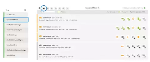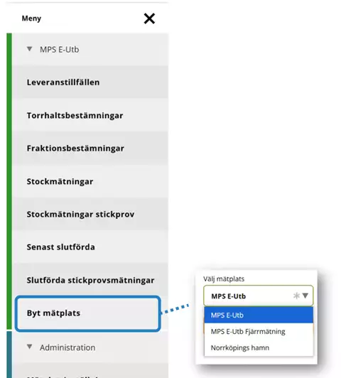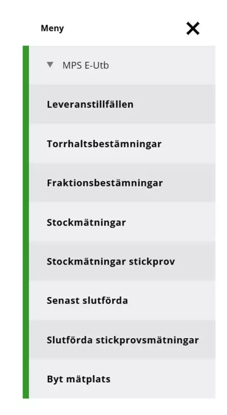 I meny för den mätplats du är inloggad på, finns de aktiviteter som är kopplade till mätningstjänsterna som utförs på mätplatsen. I bilden är vi inloggade på mätplatsen MPS E-Utb (vi kommer att gå igenom menyvalet och funktionerna gällande Leveranstillfällen i Handboken).