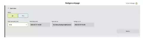 - Fast tara– är ett fast värde. En taravikt anges i ekipageregistret av en mätare. Denna taravikt gäller i 30 dagar innan den måste uppdateras.