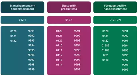 - Branschgemensamma handelssortiment - Standardiserade handelssortiment som är uppsatta i systemet med en fördefinierad produktlista. Kan jämföras med dagens Nationella mätinstruktion utan lokala avvikelser.