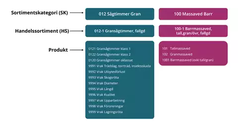Sortimentskategori är den högsta nivån i sortimentsstrukturen och innehåller både handelssortiment och produkter. Exempel: Tallsågtimmer.
