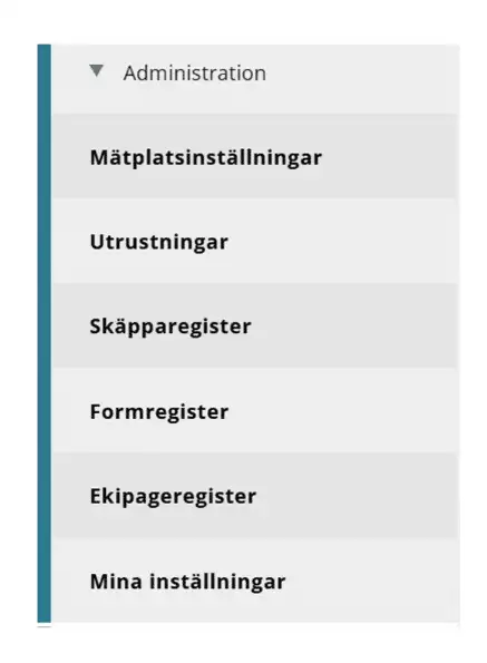 I menyn för administration finns Mätplatsinställningar och Utrustningar knutna till mätplatsen. Alla register som används lokalt och nationellt för olika mätningstjänster samt inställningar för din användare (vi går igenom mer om menyvalen för administration senare i denna Handbok).