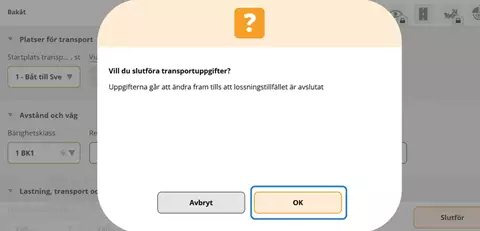 Ange om transportuppgifter ska ingå i lossningstillfället.