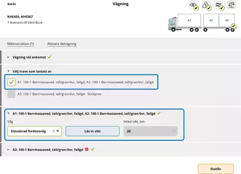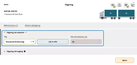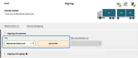 Vid nästa vägning har chauffören även lastat av även A1 och A2. Vågen visar då bilens taravikt.