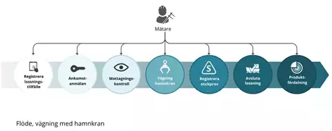 Nedan illustreras två separata flöden av arbetsmoment vid lossning av fartyg: ett flöde för vägning med hamnkran och ett flöde för vägning med fordonsvåg. Arbetsmomenten och mätningstjänsterna kan variera beroende på vilken typ av vägning och lossning som används.