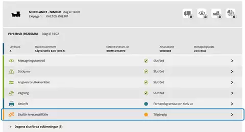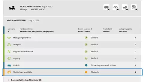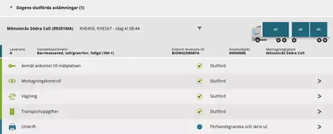 På raden för Dagens slutförda avlämningar finns samtliga dagens redan slutförda leveranser. Mer om detta finns i slutet av kapitlet Leveranstillfällen vid fordonstransport.