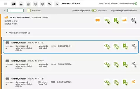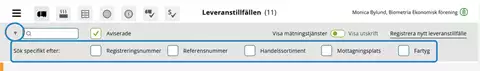 I vyn Leveranstillfällen är det möjligt att söka och filtrera på tillexempel registreringsnummer, handelssortiment och fartyg.
