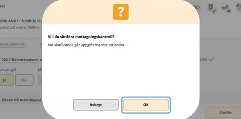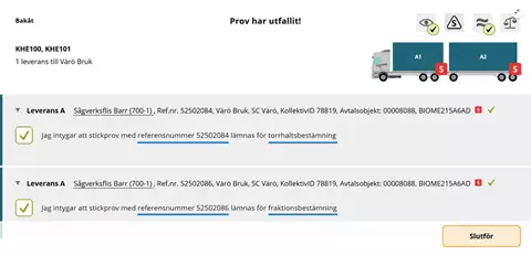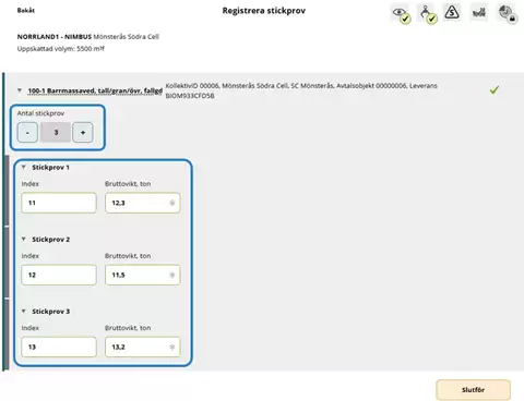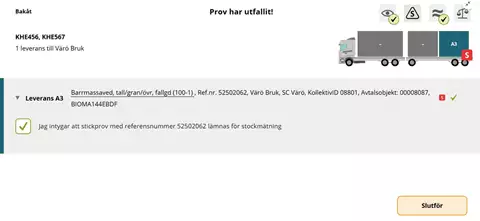 I provvyn får chauffören intyga att stickprov ska lämnas för stockmätning genom att bocka i rutan för prov och därefter bekräfta med Slutför. Provvyn ser likadan ut för mätare.
