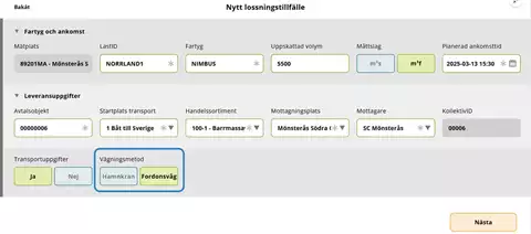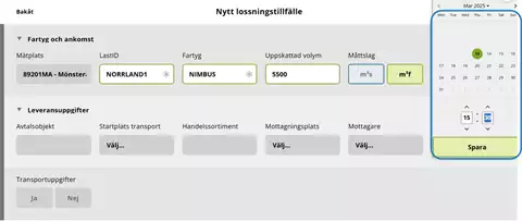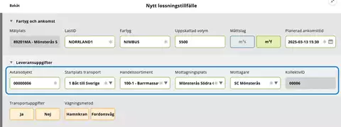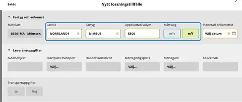 Ett lossningstillfälle kan bara innehålla en (1) leverans. Om fartyget är lastat med mer än ett handelssortiment måste du som mätare registrera ett lossningstillfälle för varje handelssortiment, även om de är lastade på samma fartyg.