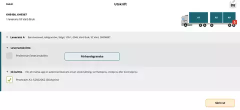 Om stickprov utfaller kommer signal om detta direkt när chauffören klickat på Registrera ny leverans på lossningstillfälle. Detta visar vi i kapitlet Stickprovshantering vid fordonstransport.