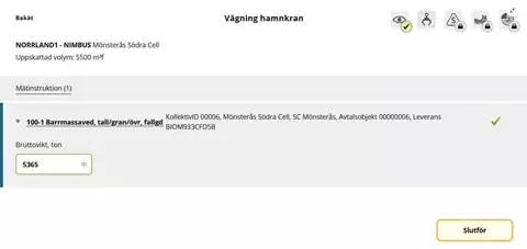 Fyll i hamnkranens summerade vikt i rutan för Bruttovikt, ton och bekräfta genom att: