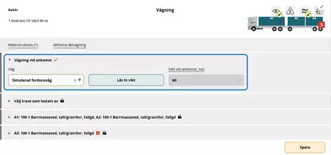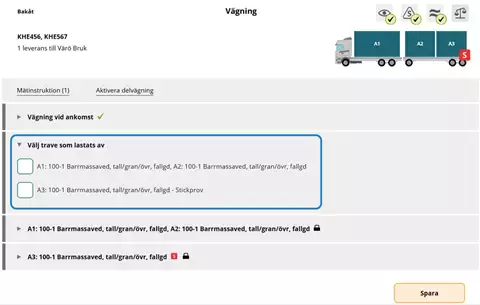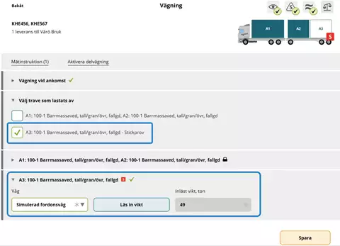 Vid vägningskollektiv, kollektivvariant 4 i VIOL 3, ska vikten för stickproven registreras separat genom stegvis instruktion i Chaufförsklienten. Först lastas antingen provtraven eller övriga travar av innan ekipaget vägs på nytt. Bocka i rutan för den/de travar som har lastats av först.