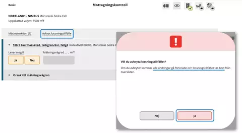 - Mätare avslutar lossningstillfället. Observera! Slutför inte produktfördelningen.
