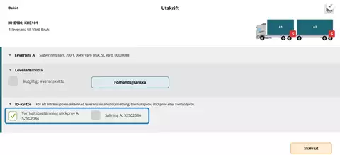 Stickprov ska märkas med ID-kvitton enligt aktuell instruktion för mätplatsen. Omedelbart efter signalen om att stickprov har utfallit finns ID-kvitton för stickprov under raden för Utskrift i både Chaufförsklienten och i Mätplatsstödet (MPS).