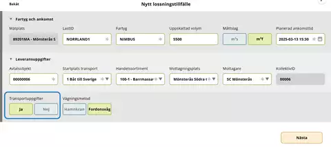 - Med transportuppgifter: Mätare administrerar transportuppgifter för varje ingående ekipage om transportuppgifter ska samlas in. Samma uppgifter gäller under hela lossningstillfället och kan vara olika för olika ekipage.