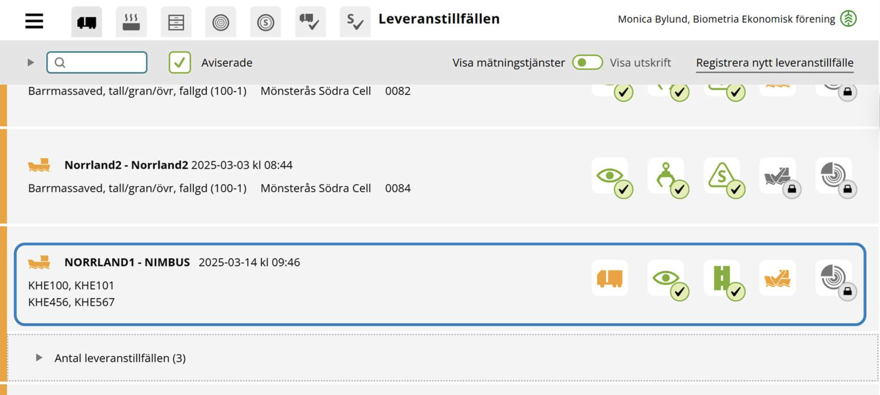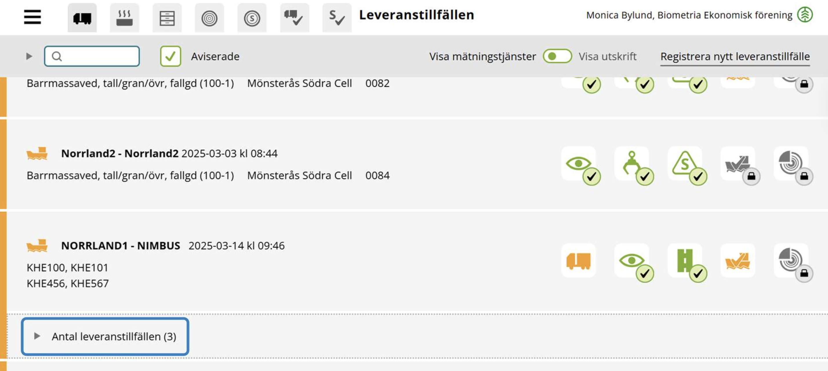 Klicka på raden så visas de slutförda leveranstillfällena.