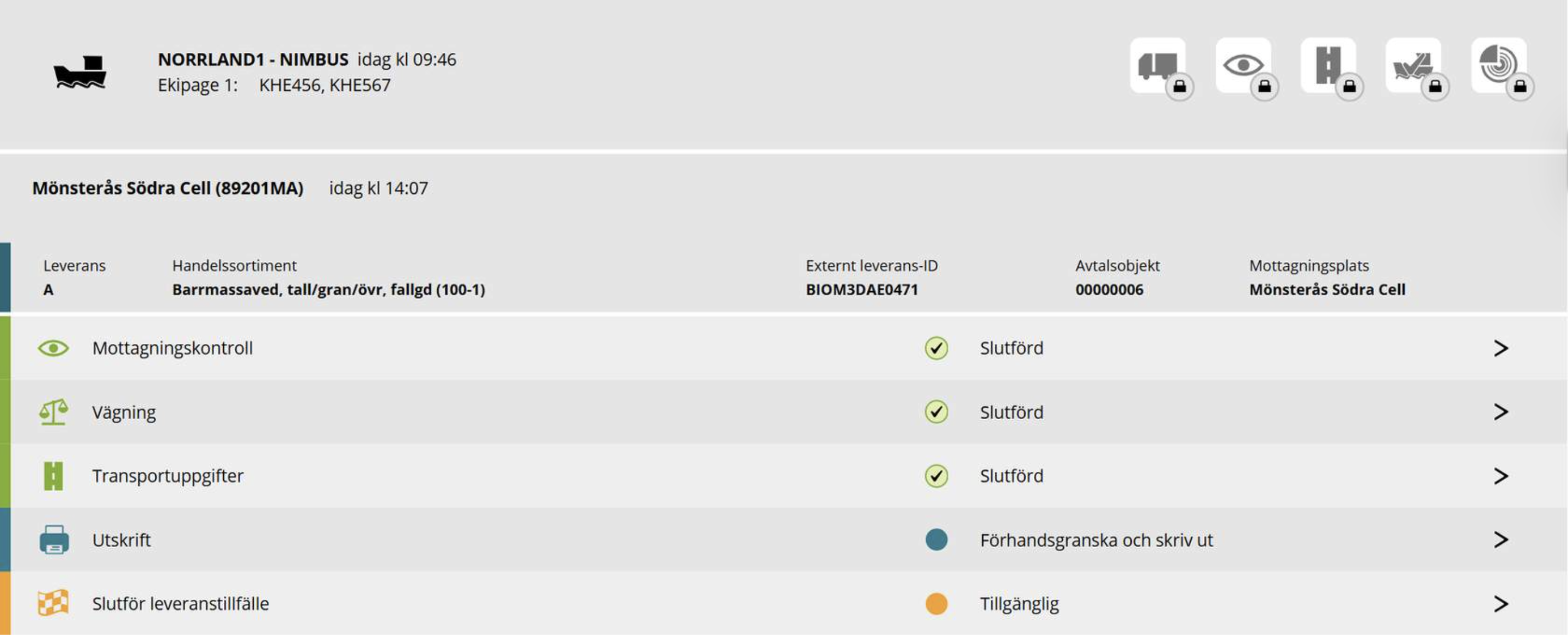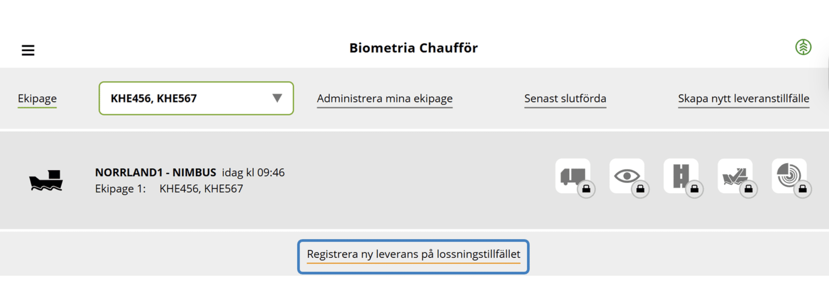 När fartyget är ankomstanmält och godkänt i mottagningskontrollen är det möjligt för chauffören att registrera leveranstillfällen för fartyget.