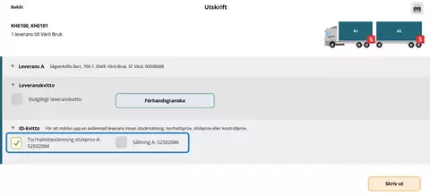 Stickprov ska märkas med ID-kvitton enligt aktuell instruktion för mätplatsen. Omedelbart efter signalen om att stickprov har utfallit finns ID-kvitton för stickprov under raden för Utskrift i både Chaufförsklienten och i Mätplatsstödet (MPS).
