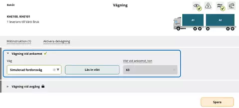 Vid nästa vägning har chauffören även lastat av även trave A1 och A2. Vågen visar då bilens taravikt (Vikt vid avgång).