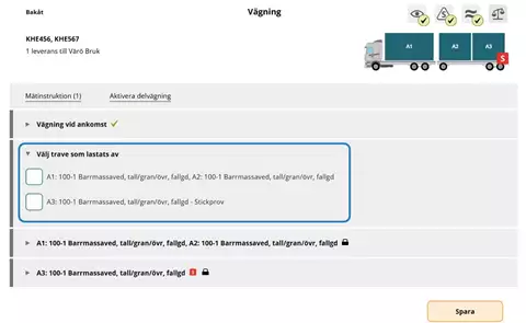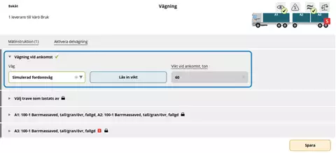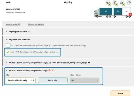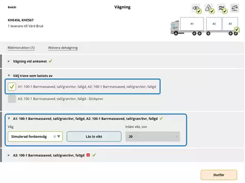Här har chauffören valt att lasta av stickprovstraven (A3) först och väger sen ekipaget igen. Vågen visar då ekipagets vikt inklusive trave A1 och A2.