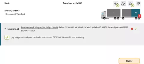 Om stickprov utfaller kommer signal om detta direkt när chauffören klickat på Registrera ny leverans på lossningstillfälle. Detta visar vi i kapitlet Stickprovshantering vid fordonstransport.