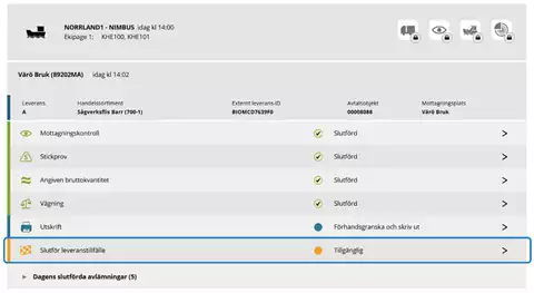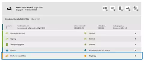 Chauffören avslutar därefter leveranstillfället genom att klicka på raden för Slutför leveranstillfälle.