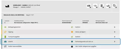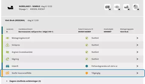 På raden för Dagens slutförda avlämningar finns samtliga dagens redan slutförda leveranstillfällen. Mer om detta finns i slutet av kapitlet Leveranstillfällen vid fordonstransport.