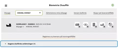 När ett leveranstillfälle är slutfört kan du som chaufför se genomförda leveranstillfällen det under raden Dagens slutförda avlämningar.