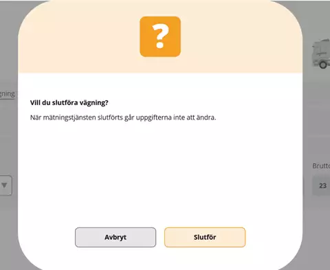 - Slutför vägningen genom att klicka på Slutför eller klicka Avbryt för att gå tillbaka och läsa in vikten på nytt.