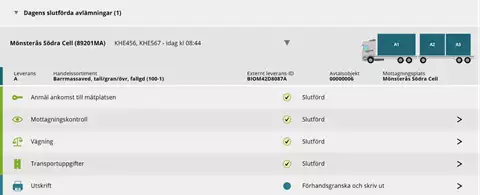 På raden för Dagens slutförda avlämningar finns samtliga dagens redan slutförda leveranstillfällen. Mer om detta finns i slutet av kapitel 1 -Leveranstillfällen vid fordonstransport.
