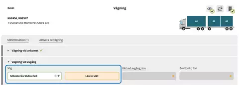Efter avlastning av råvaran ska chauffören väga ut (Vikt vid avgång).