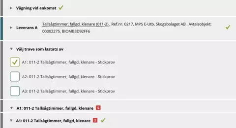 Intyga att stickprov lämnas för stockmätning genom att klicka i rutorna vid respektive prov.
