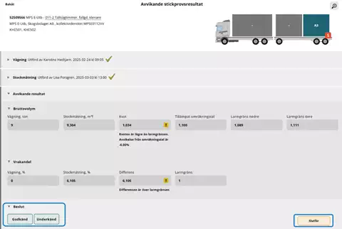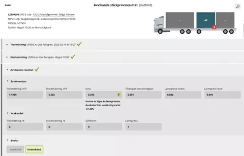 Om stickprovet får omatchade eller larmade stockar, rättas dessa i Mätplatsstödet (MPS), innan de godkänns av stickprovsmätare för att sändas vidare i systemet. Godkända stickprov ingår därefter i kollektivets omräkningstal. Ett avvikande stickprovsresultat måste hanteras av Stickprovsadministratör i Mätplatsstödet (MPS) för att skickas vidare i systemet och ingå i kollektivets omräkning. När en trave är delad ska systemet hindra att stickprovstrave utfaller på den delade traven.