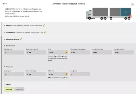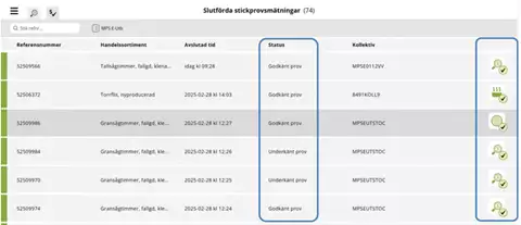 I fliken Slutförda stickprovsmätningar ser du slutförda stickprov för samtliga sortiment på vald mätplats. När ett avvikande stickprovsresultat godkänts eller underkänts hamnar det också i samma flik.