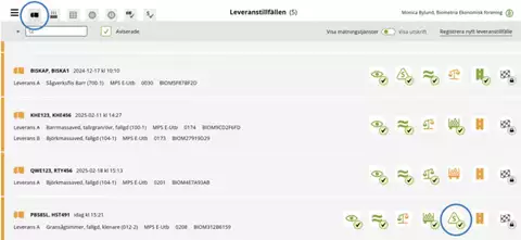 Så länge leveranstillfället inte är slutfört finns all information om det aktuella stickprovet att se på fliken Leveranstillfällen under ikonen för stickprov. Här skriver du även ut ID-kvitton för att märka provet. Uppmärkning av stickprov sker enligt aktuell arbetsinstruktion för mätplatsen.
