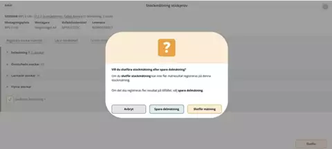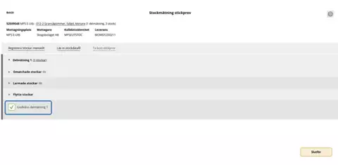 Här ser du antal delmätningar och kan visa stocklista för aktuell delmätning. Det är även här alla stickprov godkänns och slutförs för att möjliggöra omräkning av kollektivet.